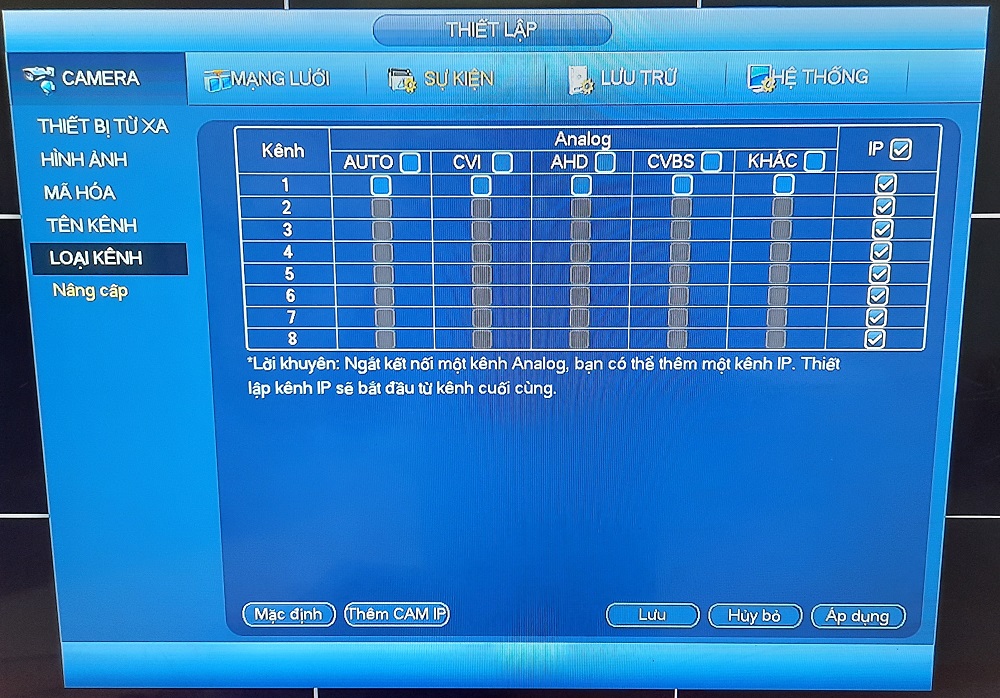 - B2: Thiết lập Loại kênh trong Menu camera -> tích chọn ô IP -> chọn áp dụng để lưu lại cấu hình