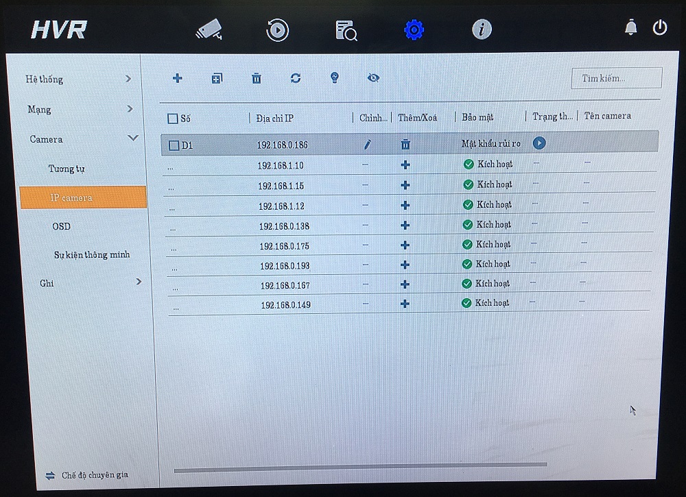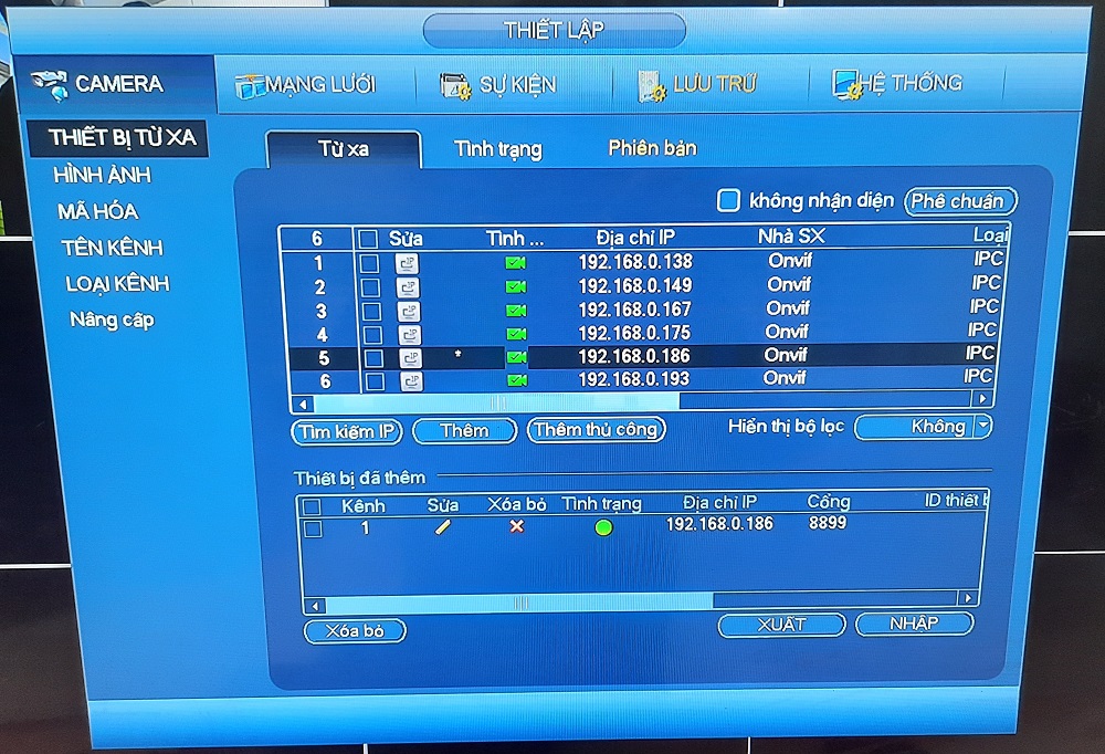 - B2: Chọn IP camera -> tìm kiếm địa chỉ IP cam có port 8899 (như hình dưới là cam IP: 192.168.0.186) -> chọn dấu cộng để add vào đầu ghi.