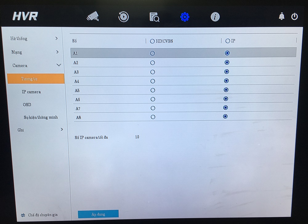 - B1: Vào giao diện cài đặt trên đầu ghi Hik -> cài đặt camera -> tích chọn ô IP -> chọn áp dụng để lưu lại cấu hình