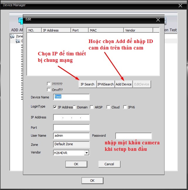 - Bắt đầu các thao tác thêm camera vào phần mềm như hình dưới: (lưu ý: camera phải được cài đặt vào mạng từ trước )