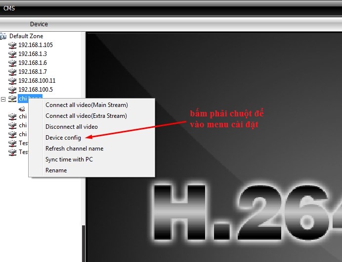 - Sau khi đã add được mắt cam vào phần mềm thì quay lại menu chính và thao tác cài đặt như hình dưới để kiểm tra port camera.