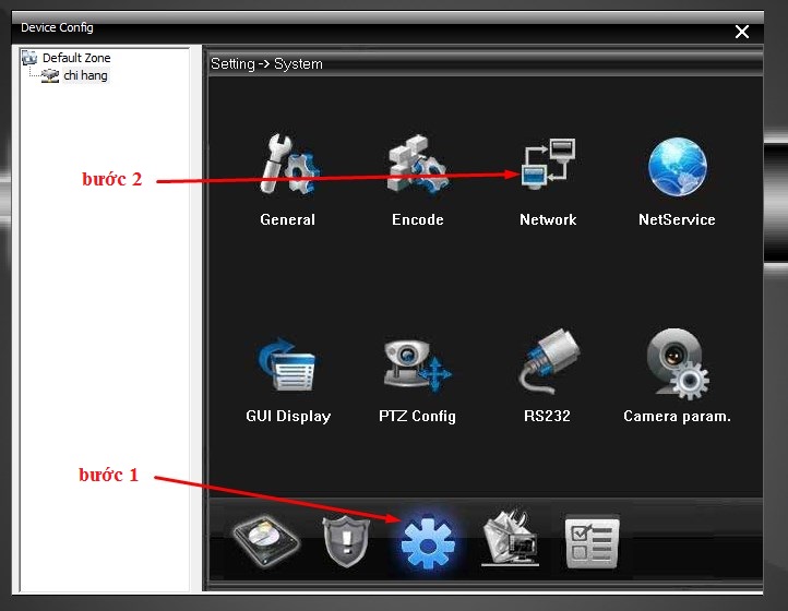 - B1: vào giao diện cài đặt trên đầu ghi dahua -> Thiết lập mạng